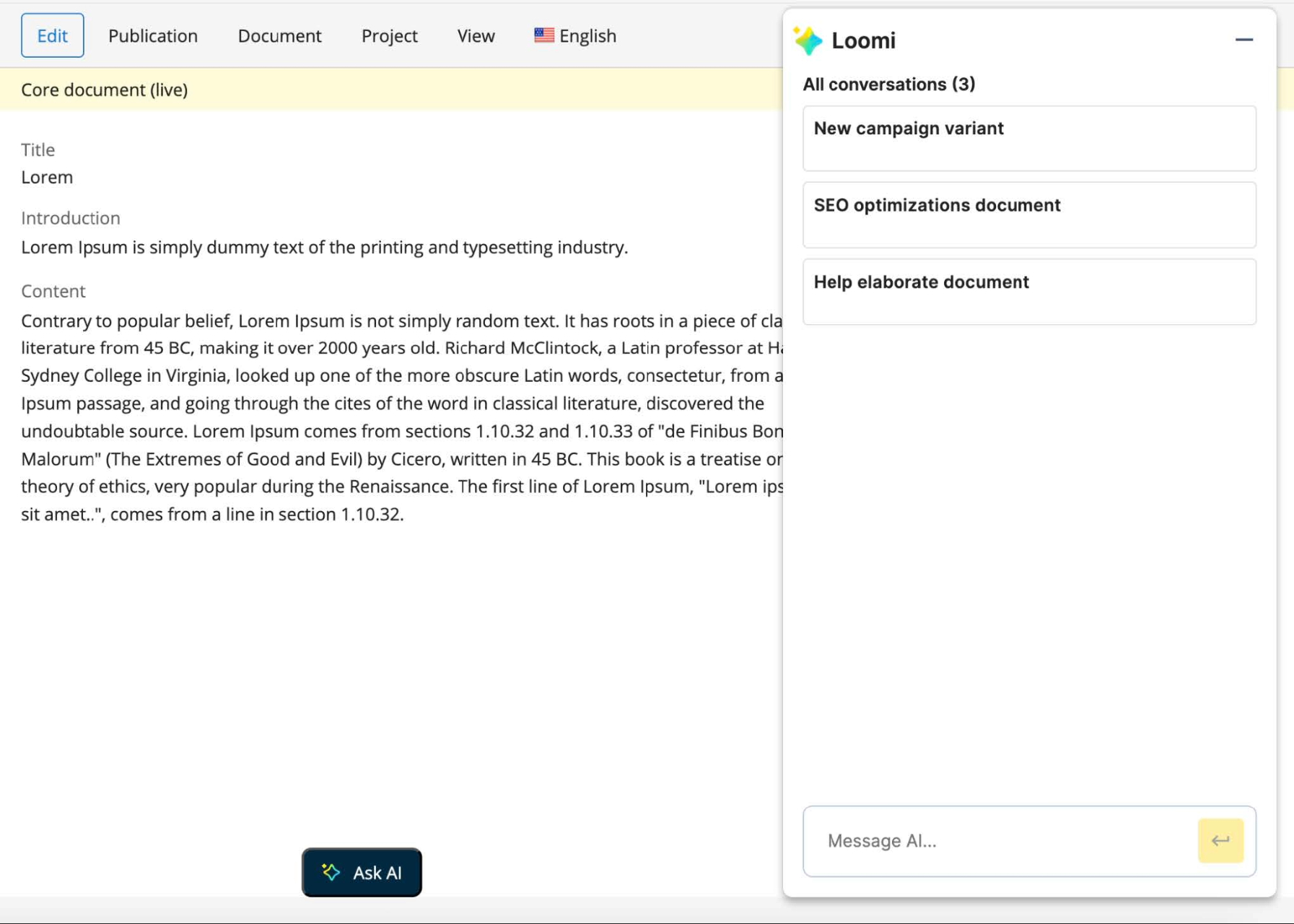 The BrXM AI Content Assistant, powered by Loomi, is your new co-pilot for content creation and management directly within the BrXM CMS. This tool is integrated into the CMS UI to provide immediate AI assistance and improve your productivity. The goal is to transform content management by boosting efficiency and innovation.