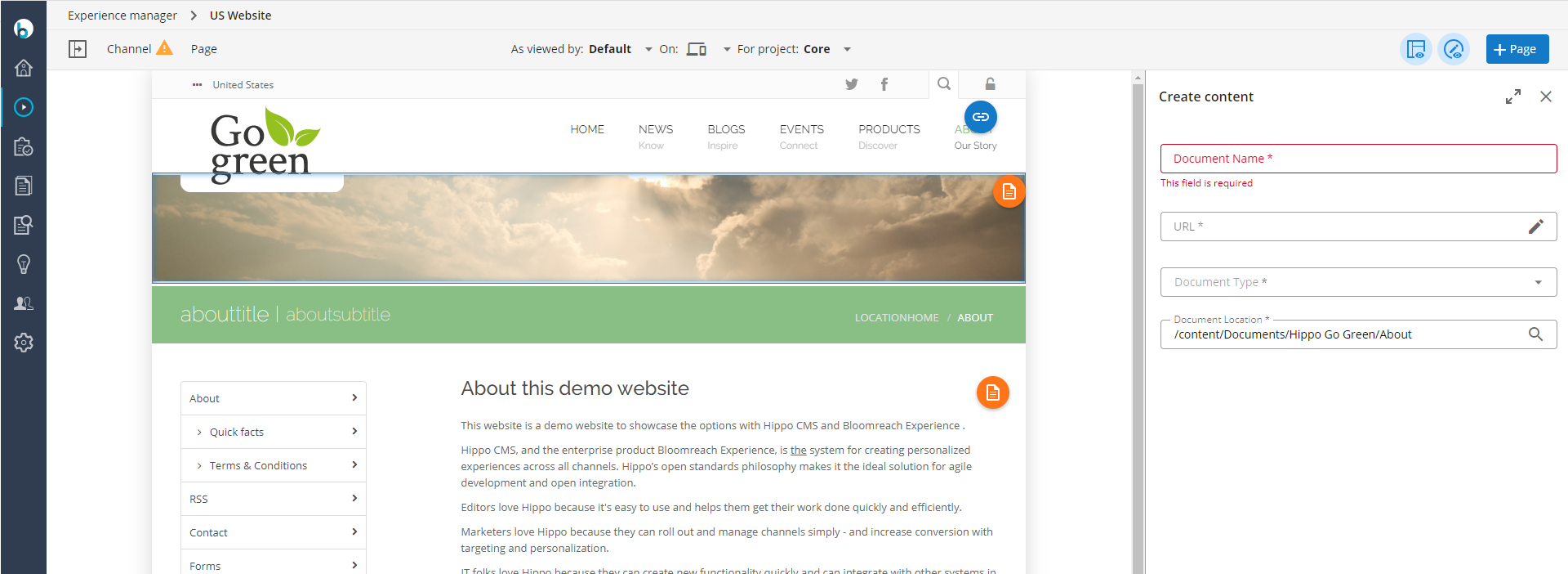 The Create content panel will ask you to give the new content a document name, type, URL, and folder location. The URL and folder location will be automatically populated for you based on the document name given and document type, but you can edit the default values given (choose a different folder location or edit the URL).